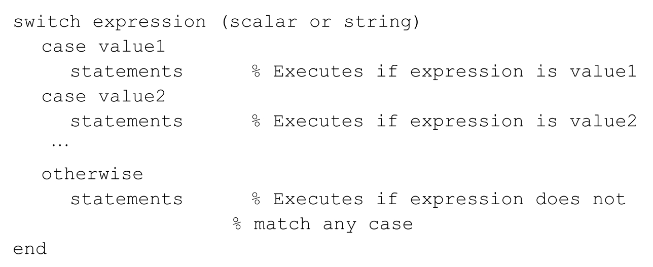 学过C语言的读者需要注意,MATLAB中的switch-case结构,只执行表达式结果匹配的第一个case分支,然后就跳出switch-case结构。因此,在每一个case语句中不需要用break语句跳出。