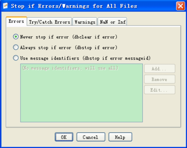 图4-6 设置出现某种运行错误或警告则停止程序运行