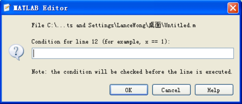【步骤1】:先运行(Run)一遍M文件,针对具体的出错信息,在适当的地方设置断点或条件断点;
