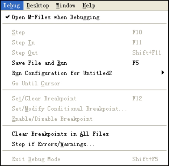 Debug菜单用于程序调试,需要与Breakpoints菜单项配合使用。MATLAB R2008b的Debug菜单中的菜单项介绍如下。