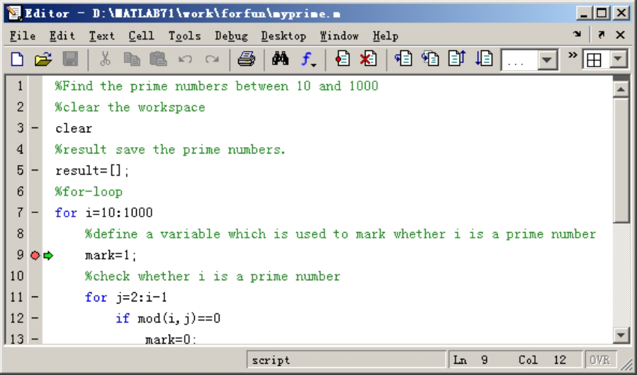在编写代码时,要及时保存阶段性成果,可以通过File菜单的Save项或者保存工具按钮保存当前的M文件。