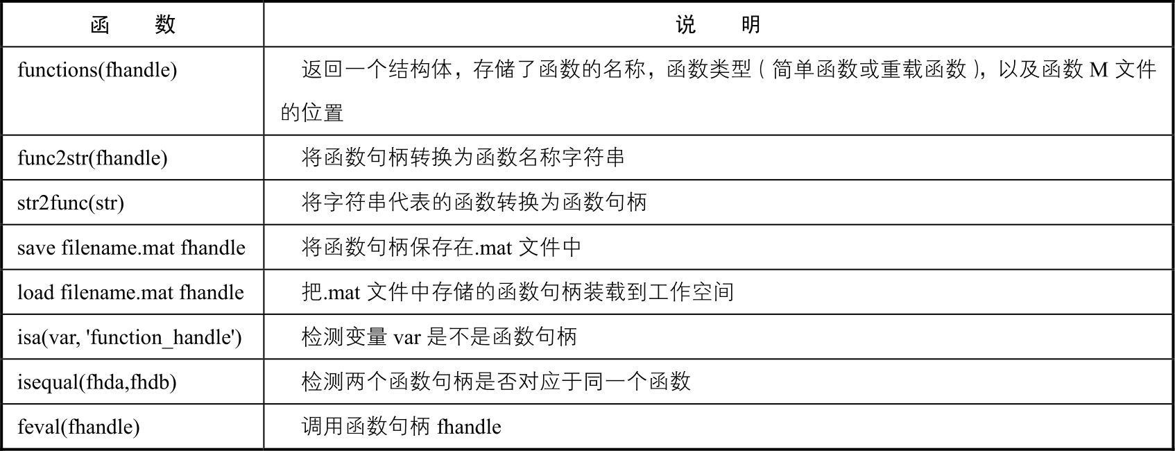 MATLAB中提供了丰富的处理函数句柄的函数,如表4.1所示。