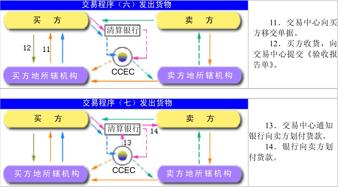 ① 买方通过其开户行将定金汇付给清算银行,清算银行将定金到账信息通知交易中心结算中心,卖方接到交易中心通知后发货。