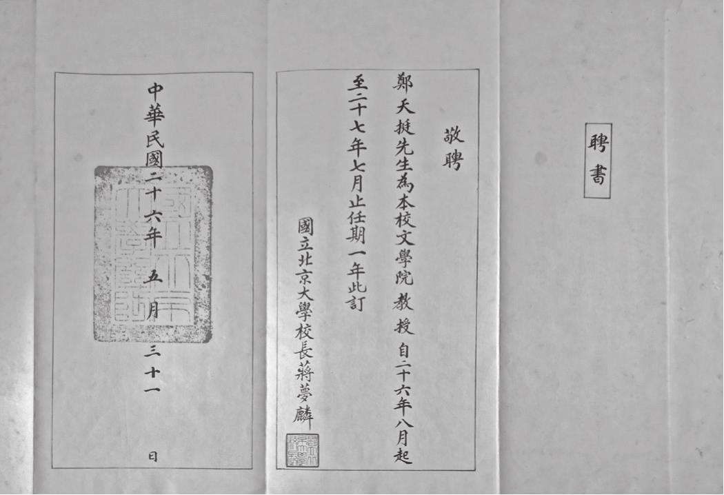 抗战胜利后,郑先生首先回到北平从事北大的复校工作,使该校于1946年顺利开课。这时郑先生仍任北大史学系教授、系主任和学校秘书长,校务异常繁忙。北平解放前夕,郑先生坚持留在当地,更好地维持和保护学校。当12月17日北大五十周年校庆之际,学校学生自治会以全体同学名义送给他“北大舵手”的锦旗。二十余年来,郑先生总是在危难的时候为北大工作,坚持保护学校,使它得以很好地运转,是北大当之无愧的功臣。