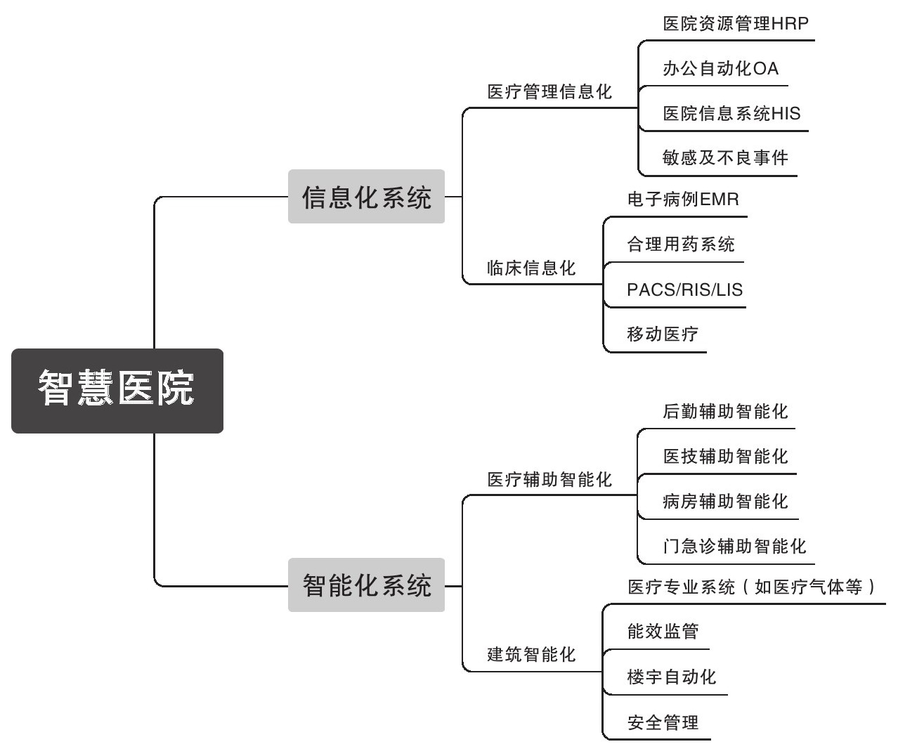 华为的智慧医疗解决方案集成应用了5G、大数据、云计算等新一代信息技术,致力于打造一个全连接、全数字、全智能的“智慧医院”(如图1-1所示),优化医疗资源配置,让医疗服务实现均等化。为了优化医院管理,提高医院运作效率,华为还为医院打造了智慧运营中心,下设运营分析、综合安防、高效办公、后勤服务、资产管理等业务模块,打造一个互联互通的运营平台,对人、财、物、医、教、研、护、药、技等资源进行科学管理,进一步提高管理的精细化程度,让每个院区的运营都做到状态可视、事件可控、业务可管。