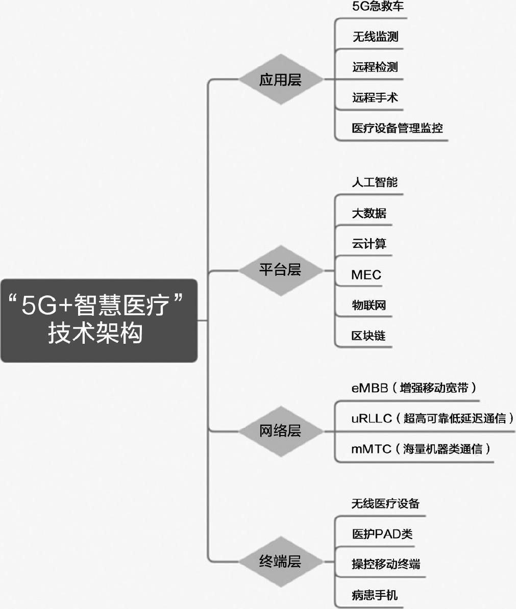 从整体架构看,以5G技术为主导的“5G+智慧医疗”共包括应用层、平台层、网络层和终端层四部分,如图2-1所示。