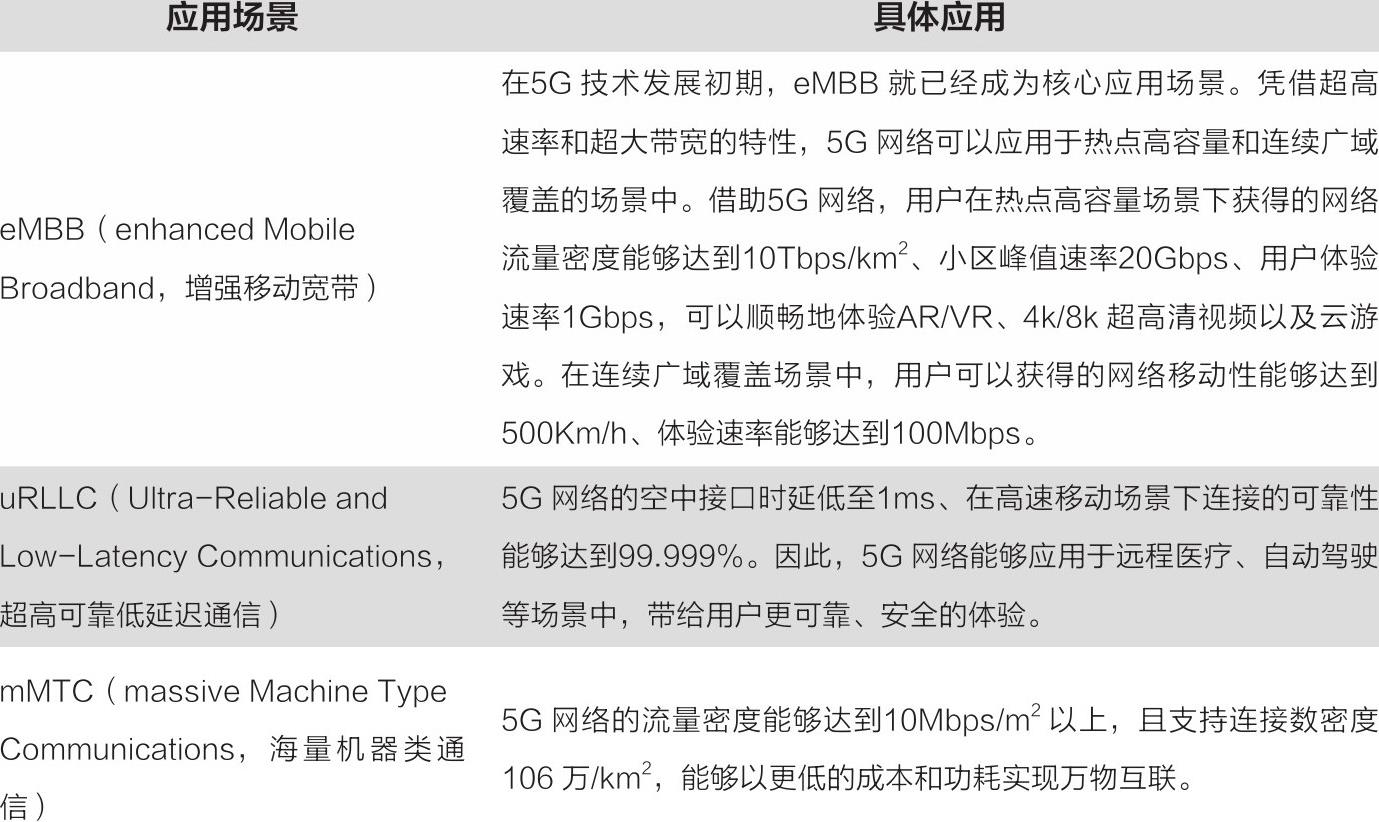 与以往的移动通信技术相比,5G技术具有三大特性,即高速率、低时延和大连接,分别应用于以下三类场景,如表2-2所示。