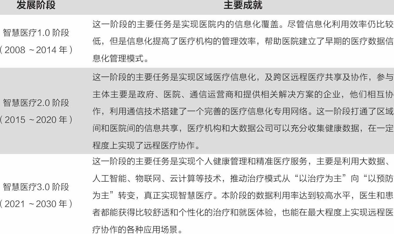 随着互联网以及相关技术不断发展,医疗产业的智慧化程度也在逐步提升。具体来看,我国智慧医疗的发展大致可以划分为三个阶段,如表2-1所示。