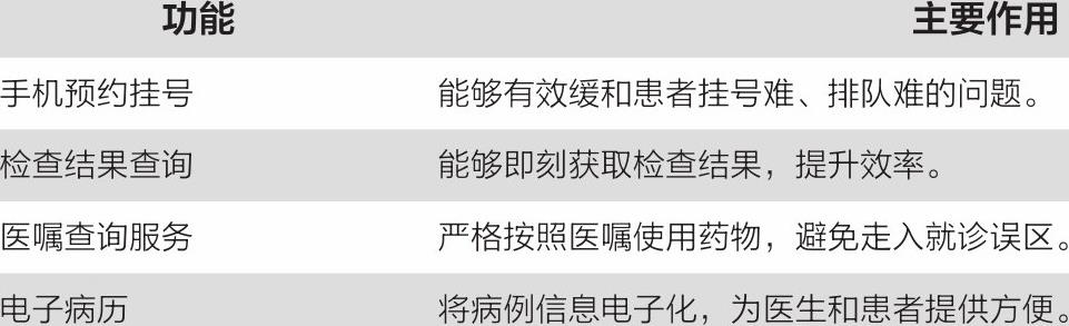 智慧医院系统不仅能解决传统医院排队挂号、无号可挂的问题,还能提供以下服务,如表3-2所示。