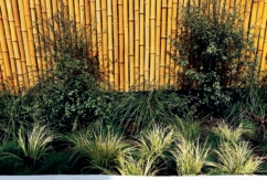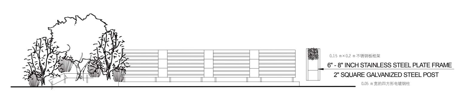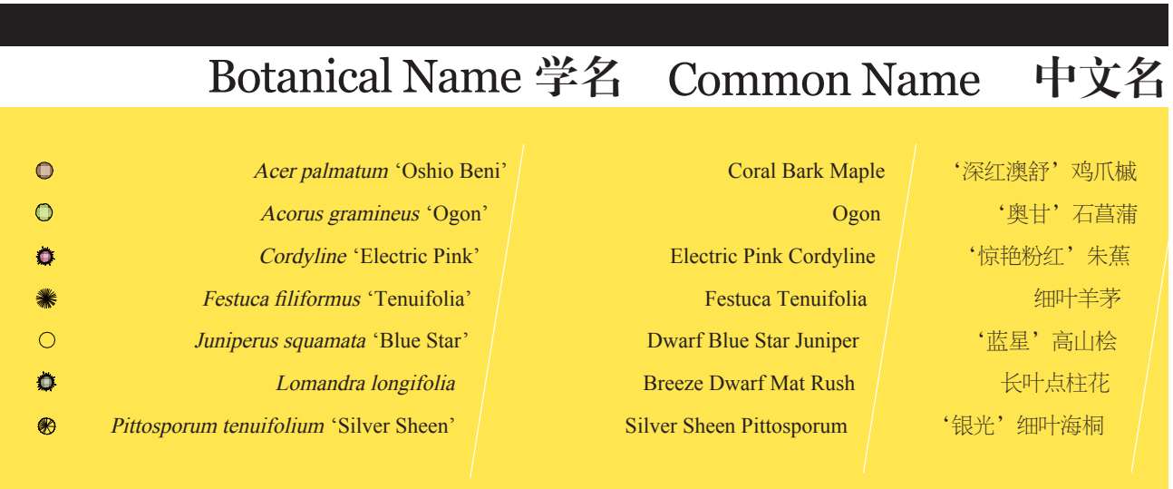 设计师通过把钢材、混凝土和重蚁木等几种材质有节制地使用在线条互相垂直的长凳、矮墙和隐藏设备的构建物中,赋予庭园一种简洁利落的线条感。植物的配置与装饰使用也和材质一样,甚为节制,因此,全园的景观之间才取得了紧密的联系,从而达到了主题上的高度统一。