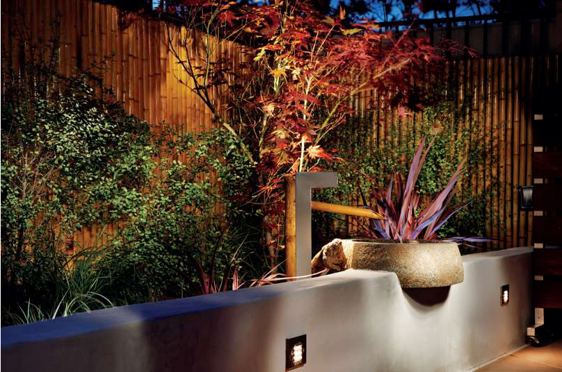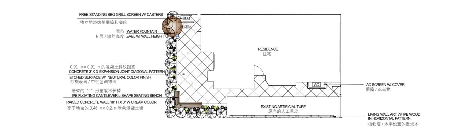 住宅的后墙拥有独立的灌溉系统。有相近用水需求的植物就被分在同一组,以优化水资源的配置。同时,后墙处的区域也种植了业主喜爱的几组植物。从后窗处能看见的位置上设置了一个手工打磨的日式喷泉,并种植了一棵挺拔秀丽的红枫,两者成为了后方庭园的视觉焦点。居住者闲时可在此处小坐,欣赏庭园美景。晚上,庭园成为了休闲玩乐的好去处,节能的低压LED景观照明灯为此添上几分情调和静谧之感。