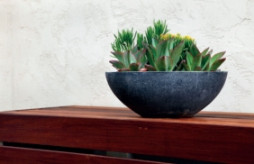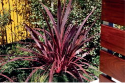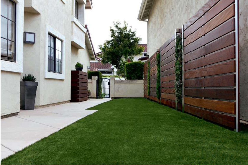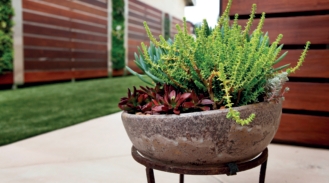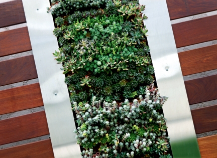 The blank wall of the neighboring dwelling became the background for an artistic vertical wall planted with succulents, creating both art and plantscape in a minimal amount of space. This living artwork of succulents symbolizes newest garden trend. An automatic drip irrigation system tends the plants. As they grow, they can be broken off and replanted in the piece. The vertical planted wall also allows full use of the side yard for a grass run for the dog to play and to use for entertaining guests.