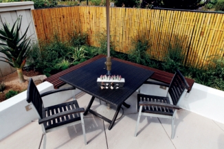 Clean minimalist lines were achieved by limiting the construction materials to steel, concrete and IPE wood expressed in vertical lines in the bench, low wall, and structures hiding the utilities. Similarly,limiting the plant palette and accessories, the designer achieved a consistent theme which ties the landscape together.