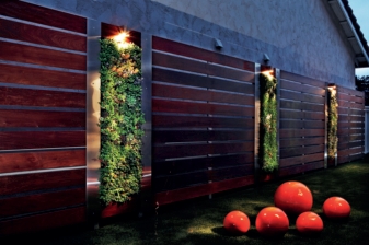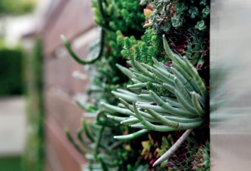 邻近建筑空白的墙面成为了一个很好的背景,衬托出种满多肉植物的垂直墙面,使这区区的方寸之地能让人同时欣赏到植物景观和享受艺术的美感。这件活生生的多肉植物艺术品,代表着庭园设计的最新趋势。这里的植物由滴灌系统灌溉,当长成后,园主就把它们从垂直墙面中分离,进行移植。由于植生墙的使用,侧院得到了充分利用,留出大片空间以种植草坪,让小狗可以在上面玩耍,并可成为招待客人的空间。