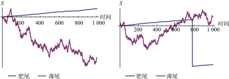 图3.20 想要“证明”薄尾分布是不可能的,但是想要证伪薄尾分布很容易。一个分布随时可能会出现跳跃,而那些平静的日子并不能帮助排除这种尾部事件。