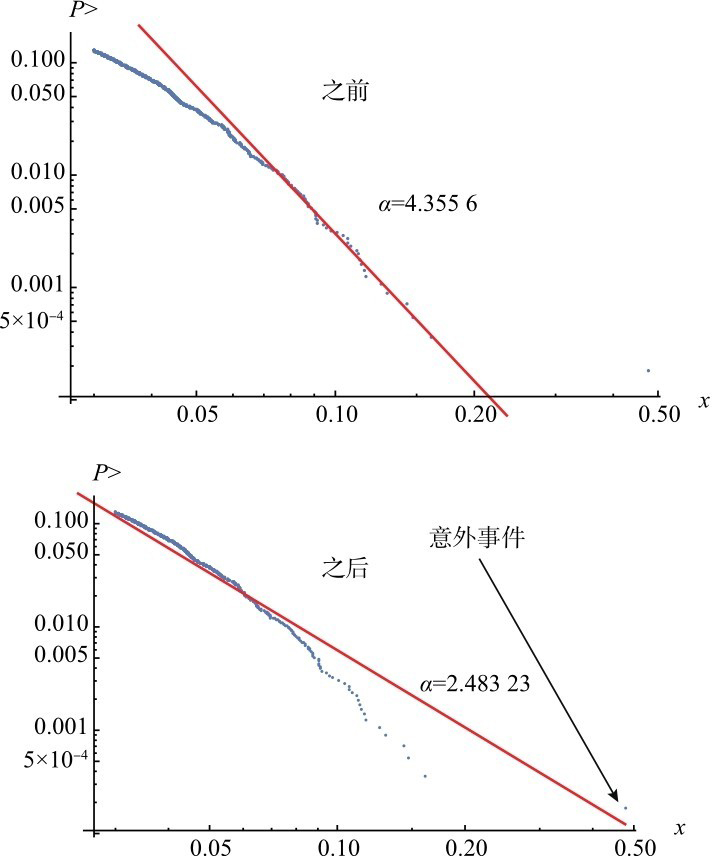 图3.21 单日回报展示分布的真实尾部,例如2019年8月12日前后的阿根廷股票市场。你可能会突然需要修正尾部参数来适应更厚的尾部(尾部指数α更小),而不会反过来,事件的发生可能需要等待很长的时间。感谢迭戈·兹维奥维奇提供的数据。
