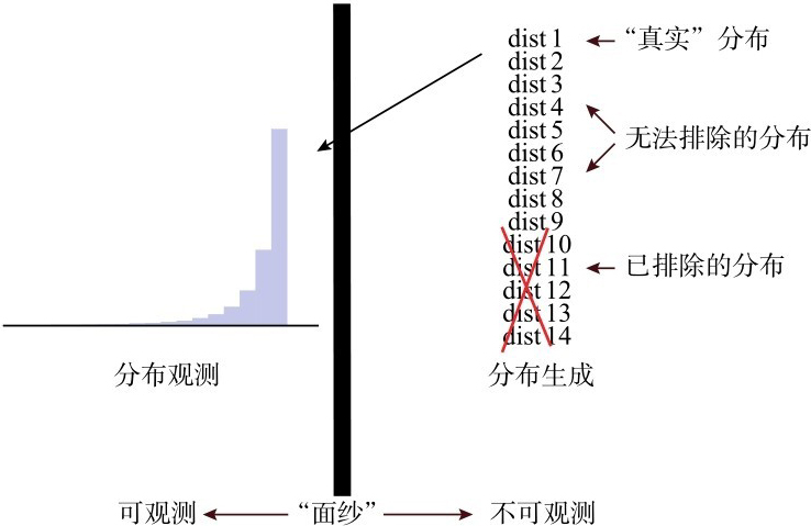 图3.17 波普尔的推导方法论同样是非对称的:实证经验主义正是从反面出发,着眼于“排除”不成立的部分。我们将这一方法延伸至统计推理,通过不断排除分布类型来处理“概率面纱”。