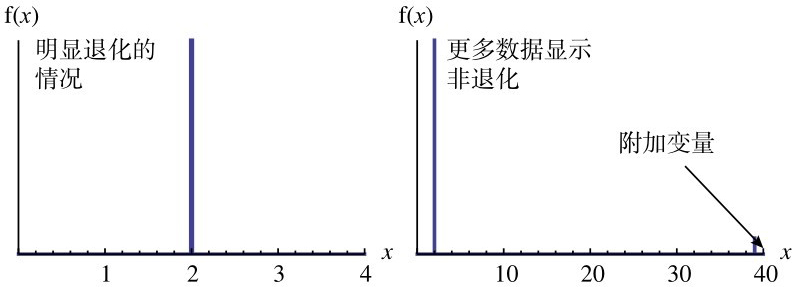 图3.15 伪装问题(或推理的中心非对称)。左边是一个退化后的随机变量,近似常量值,直方图以狄拉克细柱的形式显示。我们无法以此排除非退化的概率。右边的图出现了不止一种结果,这时就可以排除退化特征。我们可以抽象出这种中心非对称性,并给出诸如“无法拒绝原假设”之类的陈述,其中“拒绝”的定义需要稍加修正。此类非对称性可以被用来创造真正严谨的检验规则。