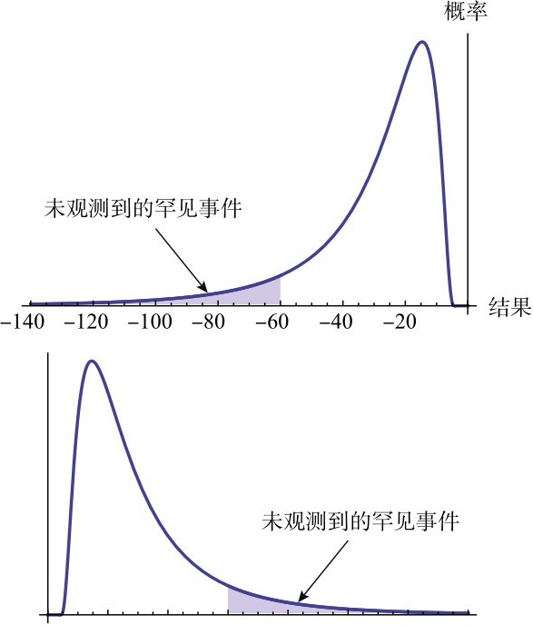 图3.28显示,如果分布是厚尾的,且只看样本均值,我们会看到更少的尾部事件。一个常见的错误是,认为我们可以简单地对单尾分布直接求均值。但是也有一些看不见的罕见事件,随着时间推移总会发生,只是根据定义,这些事件发生的概率极小。