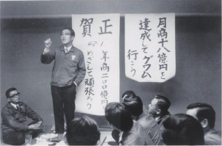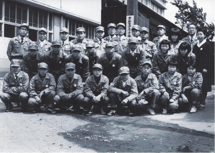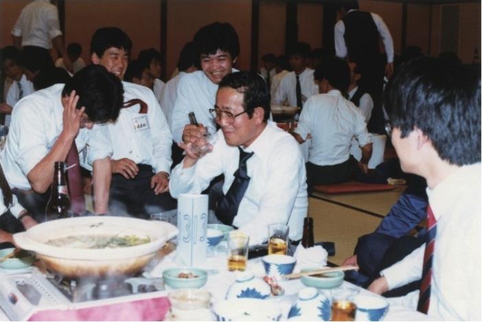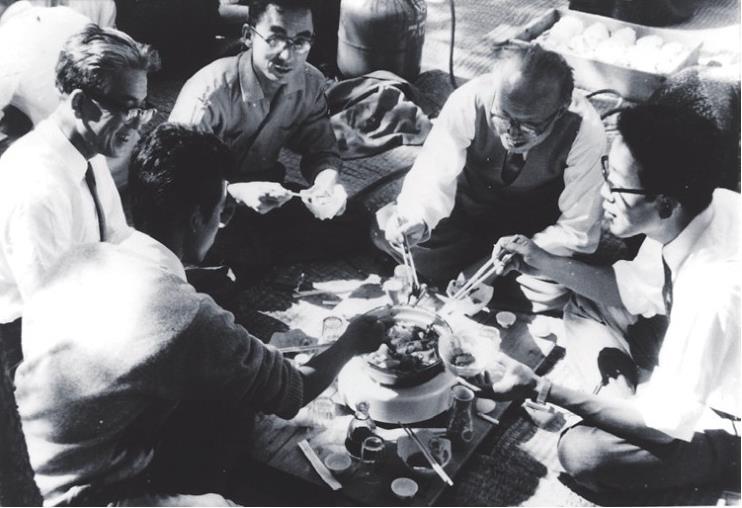 滋贺工厂的火锅聚餐(最右者是稻盛)。从创业初始便举办联欢活动,加强公司员工的凝聚力。