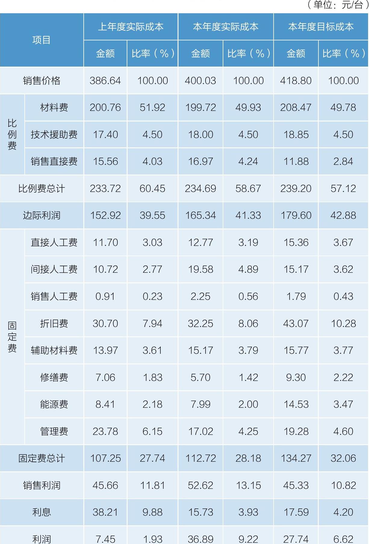 某企业为了提高成本竞争力,非常重视产品单位成本管理。该企业每个系列都选择一个代表型号,统计代表型号产品的单位变动成本和固定成本,对于不能统计的变动成本和固定成本,则将总成本分摊到单位产品,从而得出该产品的单位成本水平(表1-2),在此基础上,将实际单位成本与市场价格、目标单位成本、竞争对手单位成本以及价格变化趋势进行对比,从而找到改进方向。