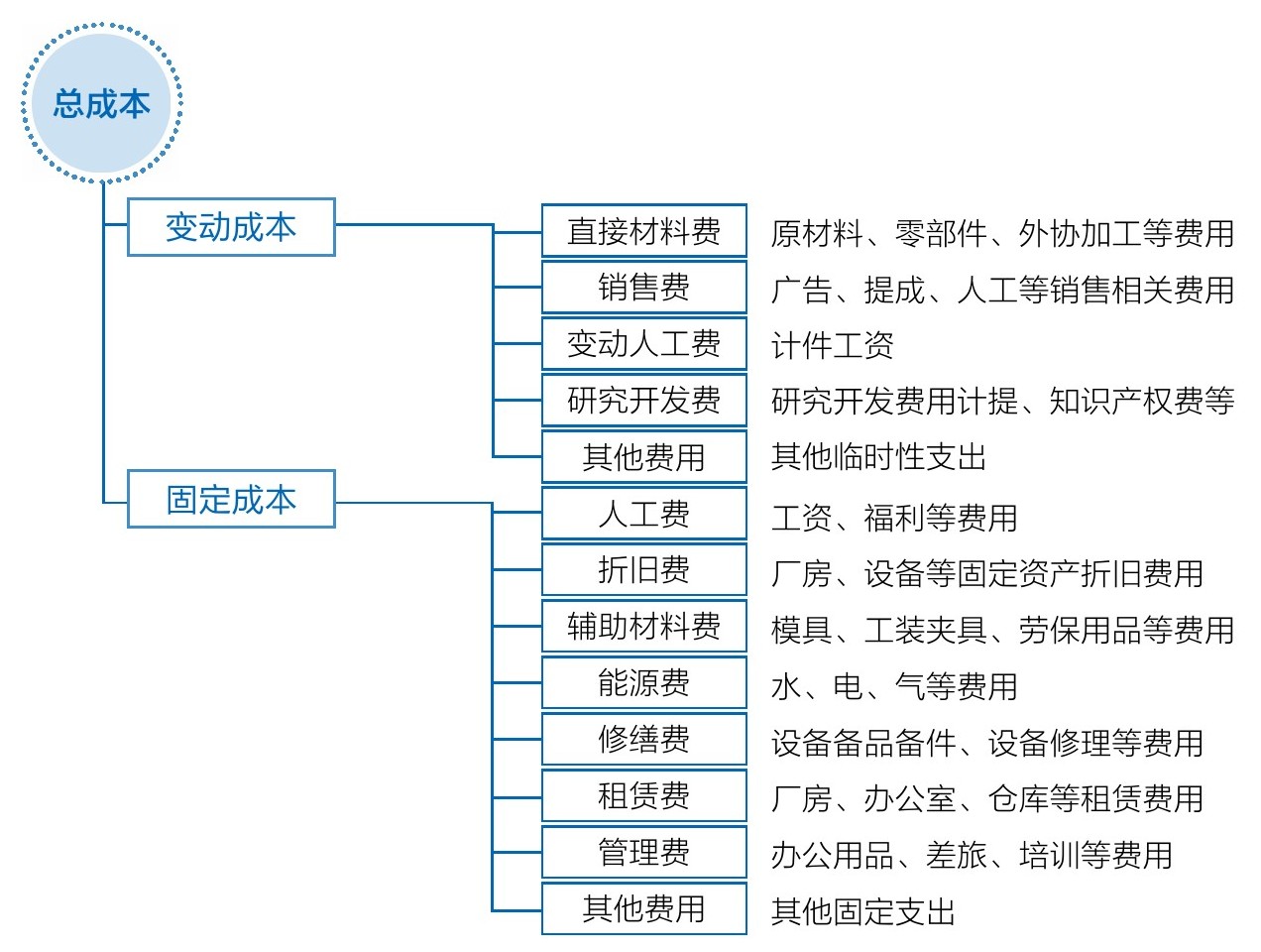 从案例2《利润表》可以看出,企业总成本包括变动成本(比例费)和固定成本(固定费)两部分,而变动成本又包括直接材料费、销售费、变动人工费、研究开发费及其他临时性支出费用等,固定成本又包括人工费、折旧费、辅助材料费、能源费(动力费)、修缮费、租赁费、办公费及其他固定支出的费用等(图1-5)。