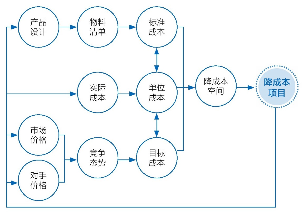 企业为使自己的产品有竞争力,需要制定一个比竞争对手更有优势、对客户和本企业又最有利的销售价格,同时要确保合理的利润,为此,就要在成本控制上下功夫,即通过市场竞争分析设定合理的、有竞争优势的成本控制目标,再围绕这一目标挖掘降成本空间,确定具体的降成本项目,进而推进降成本活动,最终实现成本目标,创造合理利润。