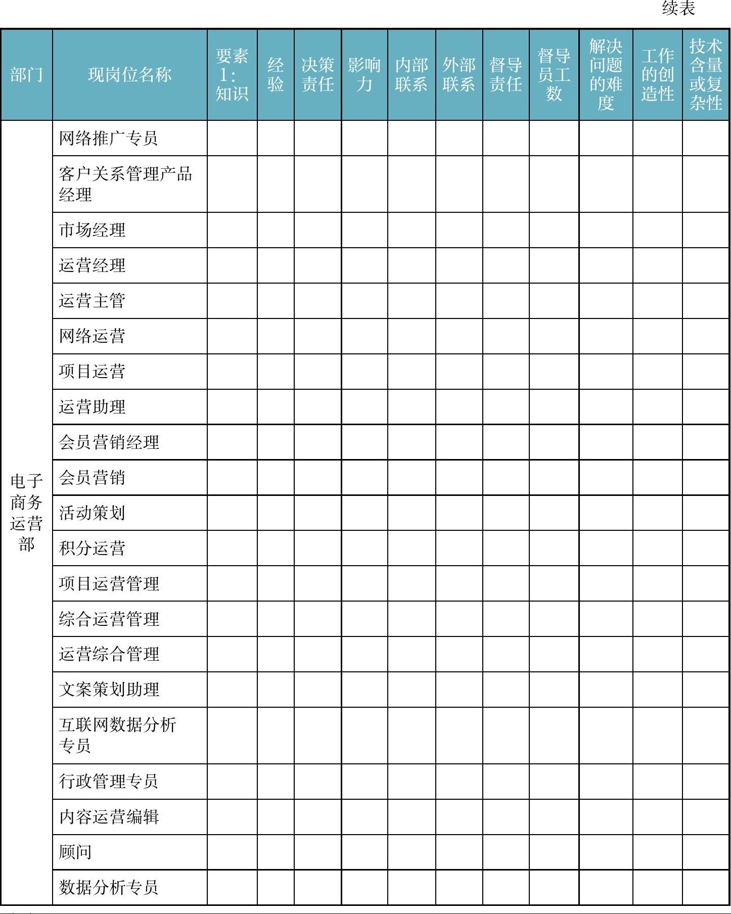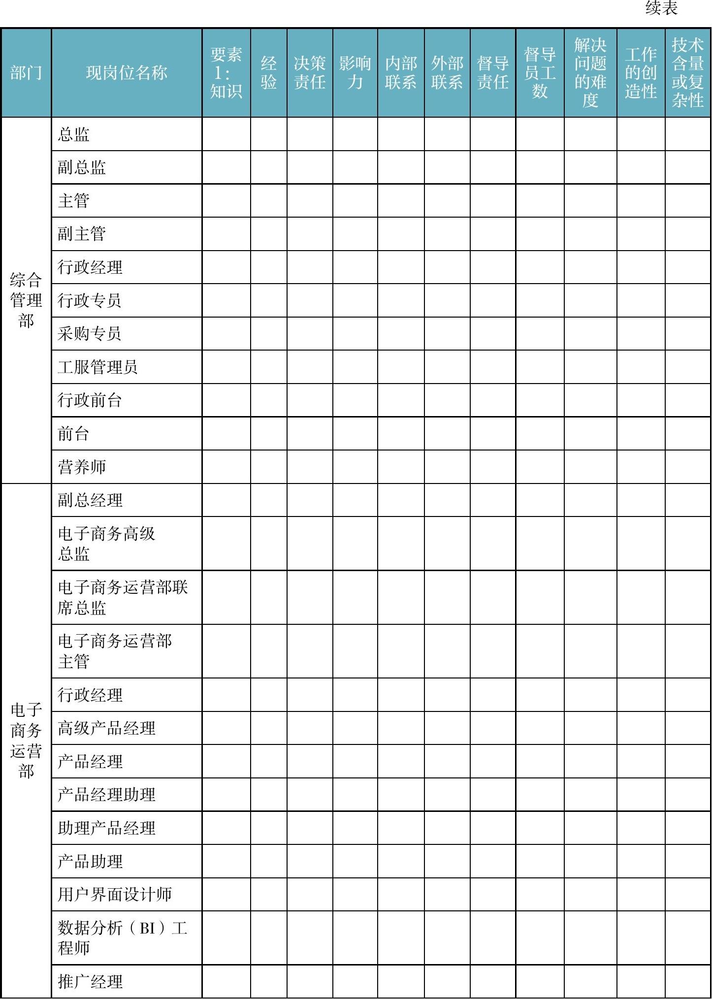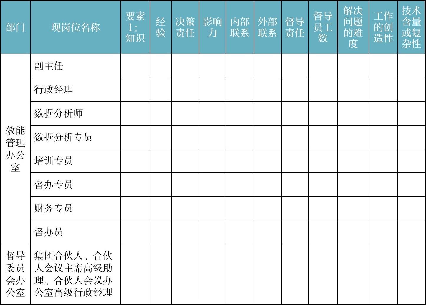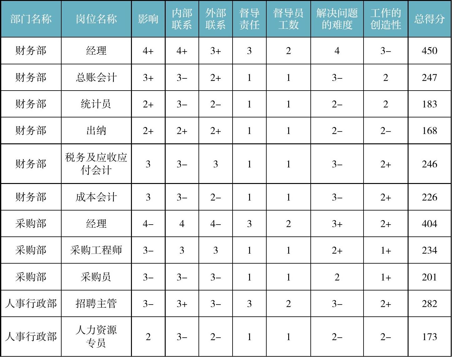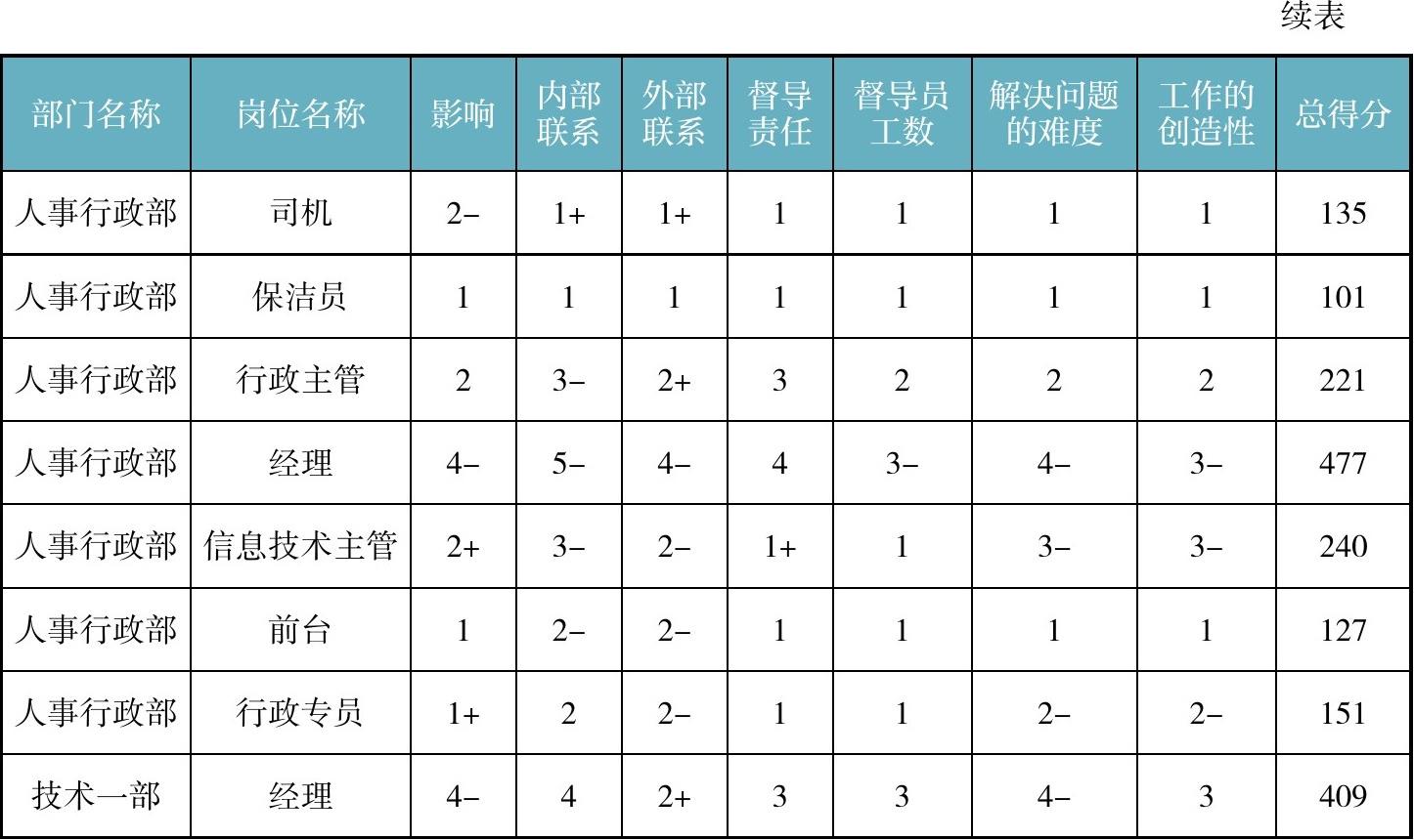进行岗位测评时,可使用表2-7。由公司核心领导,对企业所有岗位,集体进行测评打分,从而定级。