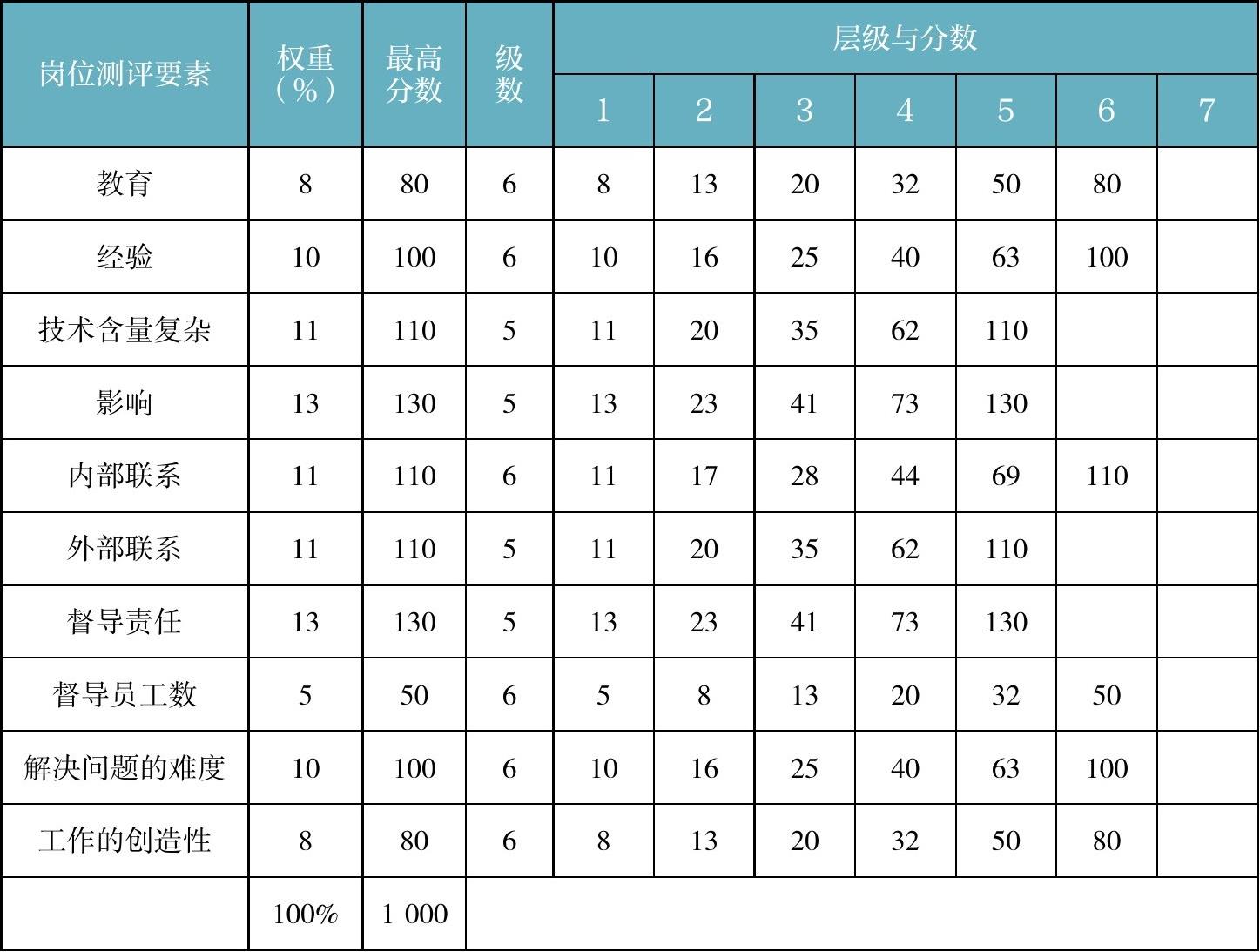 录入权重和要素的等级总数后,接着设定每个要素的每级折合多少分,如表2-5所示。这样才能给不同的岗位打出分数,知道它在每个要素上被评为几级,折合多少分,全部起来就是该岗位总分。每级设定的折合分数,是按照同样的比例从1级到6级递增的,以此凸显高等级的更高价值。但是,如果想将要素各等级的分数进行均分设定,实际也是可行的。从评价的理论上来讲,评价工具的小差异对评价最终结果的影响并不像我们想象得那么大。