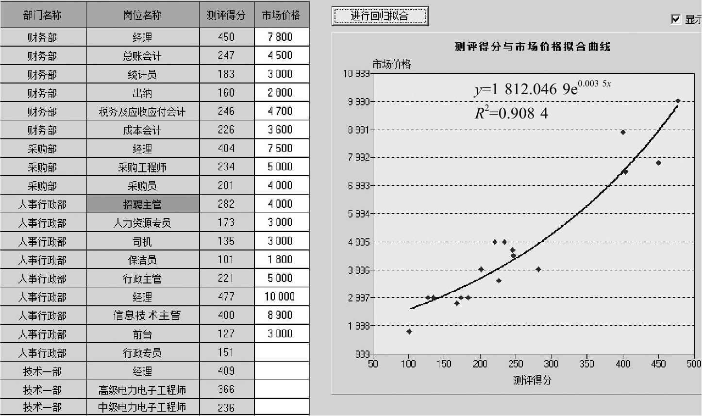 岗位测评结果出来后,似乎没办法知道测评结果的准确性,但我们在上文已经介绍了回归拟合,它可以校验评估的结果是否和市场趋势相符合。大致说来,是把每个岗位的测评分数作为横坐标,把其市场价格作为纵坐标,这样就画出一个点。多个岗位,就有多个点,然后画出一条趋势线——所谓趋势线,就是离每个点都最近的一条线。