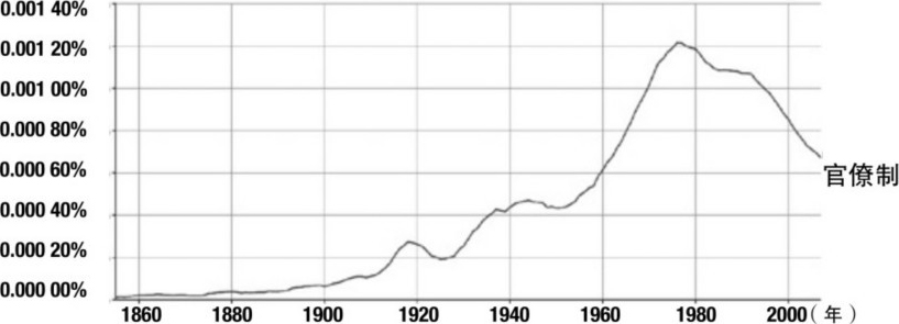 下图勾勒出了过去一个半世纪里“官僚制”一词在英文著作中的出现频率。及至“二战”,这一话题还不温不火,而从20世纪50年代开始,对它的讨论度飙升,并于1973年达到巅峰,随后缓慢却决绝地降了下去。