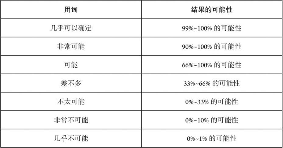 我们的第二个问题是:什么样的未来最可能发生?也正是在思考这个问题时我们会期望过去的趋势可被当作指南。但要说过去的趋势是否规律以及所能提供的指导效果如何,这些过去的趋势可就千差万别了。在诸如气象预报这样的领域,人们普遍会给可能性加上具体概率,并以此来预估天气变化。比如,在2010年版的学术写作指南中,联合国政府间气候变化专门委员会就提出了七个不同的程度。