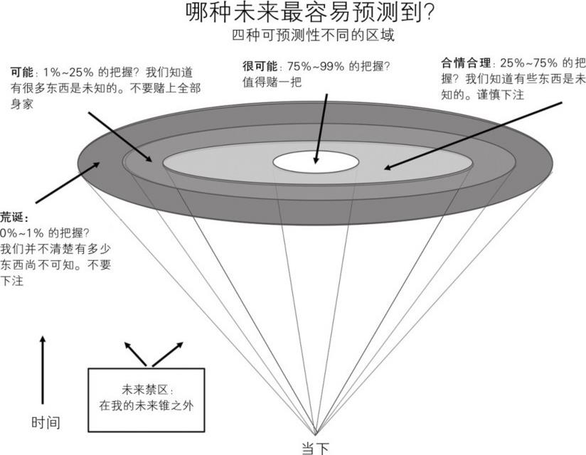 就可预测性而言,我们的二号未来锥把这些程度简化为四个区域。对于这些可能性的百分比不用太较真,它们仅仅起到示意作用。
