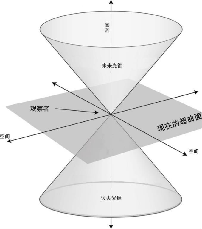 图2.1 爱因斯坦—闵可夫斯基的光锥与因果观点