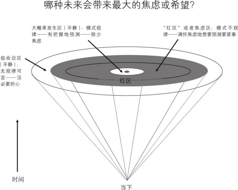大多数未来思维都是强烈的情感使然。对于无法预测的未来,我们不会付诸什么情感,也不会费脑子去想。它们就是二号未来锥最外围的“荒诞区”。对于预测时可以八九不离十的未来我们也不会太担心,它们处于“很可能”这一区域中。临刑死囚所表现出的泰然自若便属于这一区域。“可能区”和“合情合理区”才是强烈情感的汇集之地。在这些区域中,我们看到了预测并左右自己所在乎的未来的希望。这里是“红区”,它让我们对预测并掌控未来可能发生的事有了激情和热望。这些区域的存在把人们送到了占星师和算命先生的跟前,也正是这些区域让当代的企业高管们斥巨资去雇用经济预测师。专家级的预测师会提出信心满满的建议,也会消弭人们因未知而生的痛苦不安。不过,当预测错到离谱时,他们也可以充当替罪羊。 29