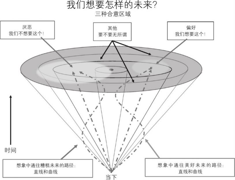 作为带有目的性的主体,我们需要问自己关于未来的第一个问题便是:我们想要怎样的未来?我们的第一个未来锥想要反映的是我们自己的直觉。在我们的直觉当中,未来包含糟糕之地、美好之地以及很多介于它们之间的地貌形态。正常情况下,我们都会向着美好之地进发,那里就是乌托邦。我们对糟糕之地避之不及。