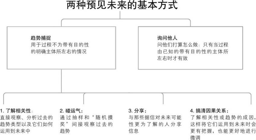 第四条原则最为基本,但也最为复杂:尽管没有来自未来的证据,我们仍 可以 在过去找到关于未来的强力暗示。想要达成这点主要有两个办法:(1)我们可以问问其他带着目的的个体计划做什么;(2)我们可以研究过去的潮流大势,再小心翼翼地将之投射到未来当中。
