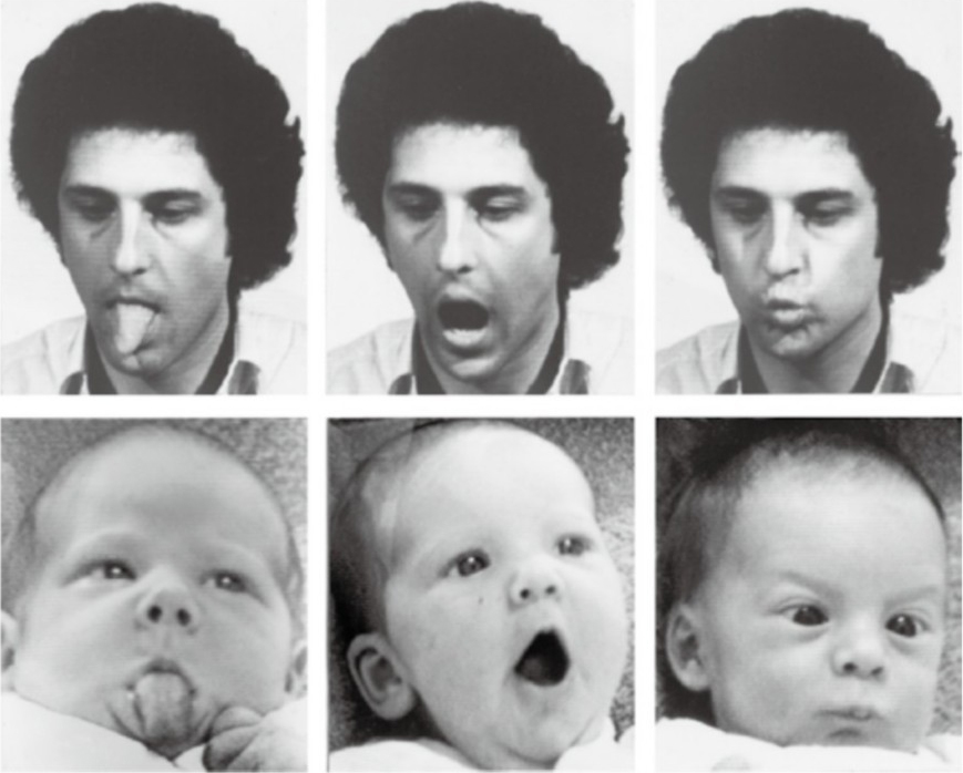 在1977年他最著名的一项实验中,梅尔佐夫(与合作伙伴M.K.摩尔一起)在西雅图的一家医院,通过向新生儿伸出舌头来观察他们的反应,参与这项研究的婴儿平均年龄是32个小时,令人惊讶的是,其中一个来到世界只有42分钟的婴儿模仿了他的表情,以惊人的准确度做出了回应。这是她第一次看到有人向她伸出舌头或做鬼脸,但她似乎意识到,她和这个出现在自己面前的生物“一样”,都有一张脸,这意味着“他能做,我也可以”。 6