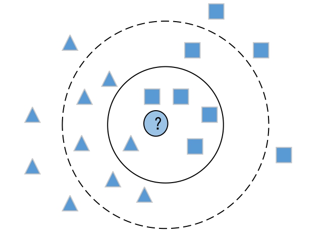 如果 k =5,在圆形最近的样本点中,有4个正方形和1个三角形,根据少数从属于多数的原则,判定圆形这个待分类样本属于正方形表示的样本一类。