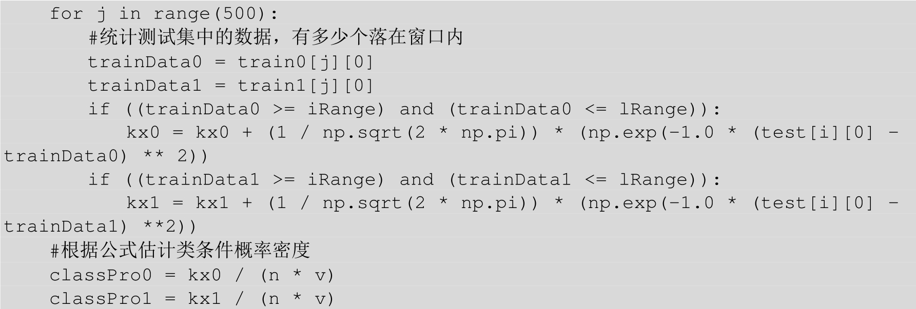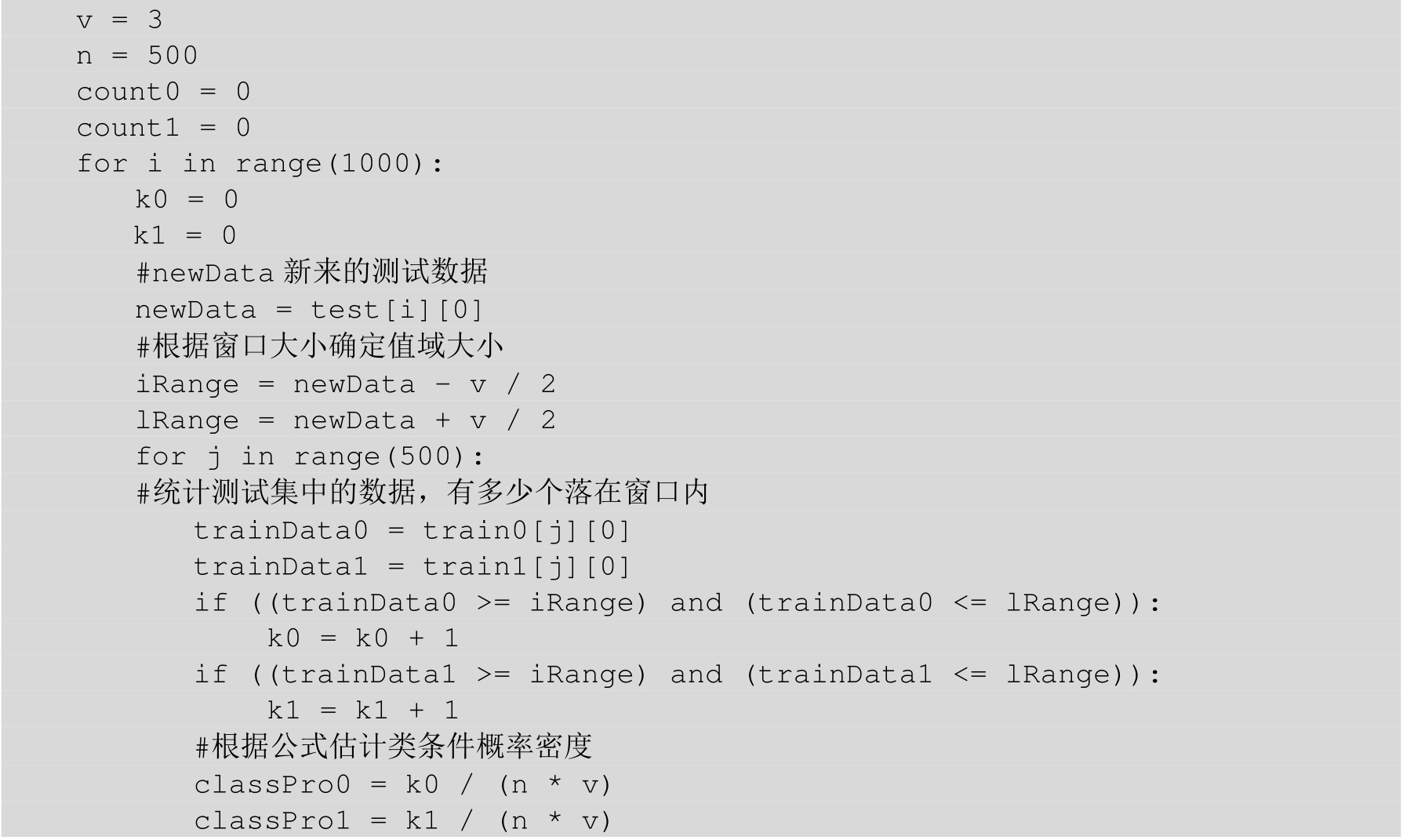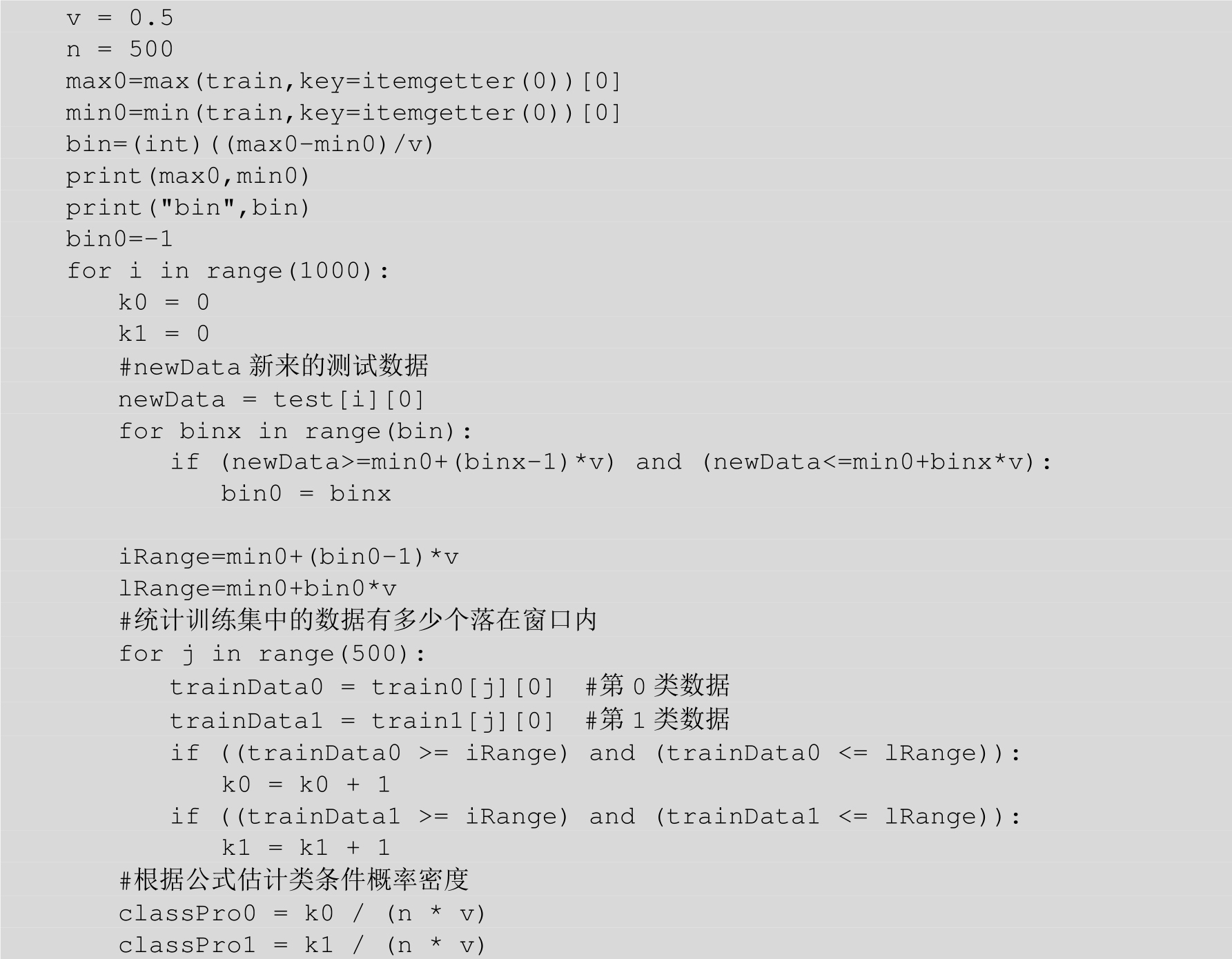 设置窗口大小v,求出训练集中样本的最大值max0和最小值min0,计算训练集被划分为多少个区间bin。对每一条测试数据newData,先以newData为中心确定其所处的区间bin0,然后统计训练集中各个类别有多少样本点落在bin0中,估计概率密度值。