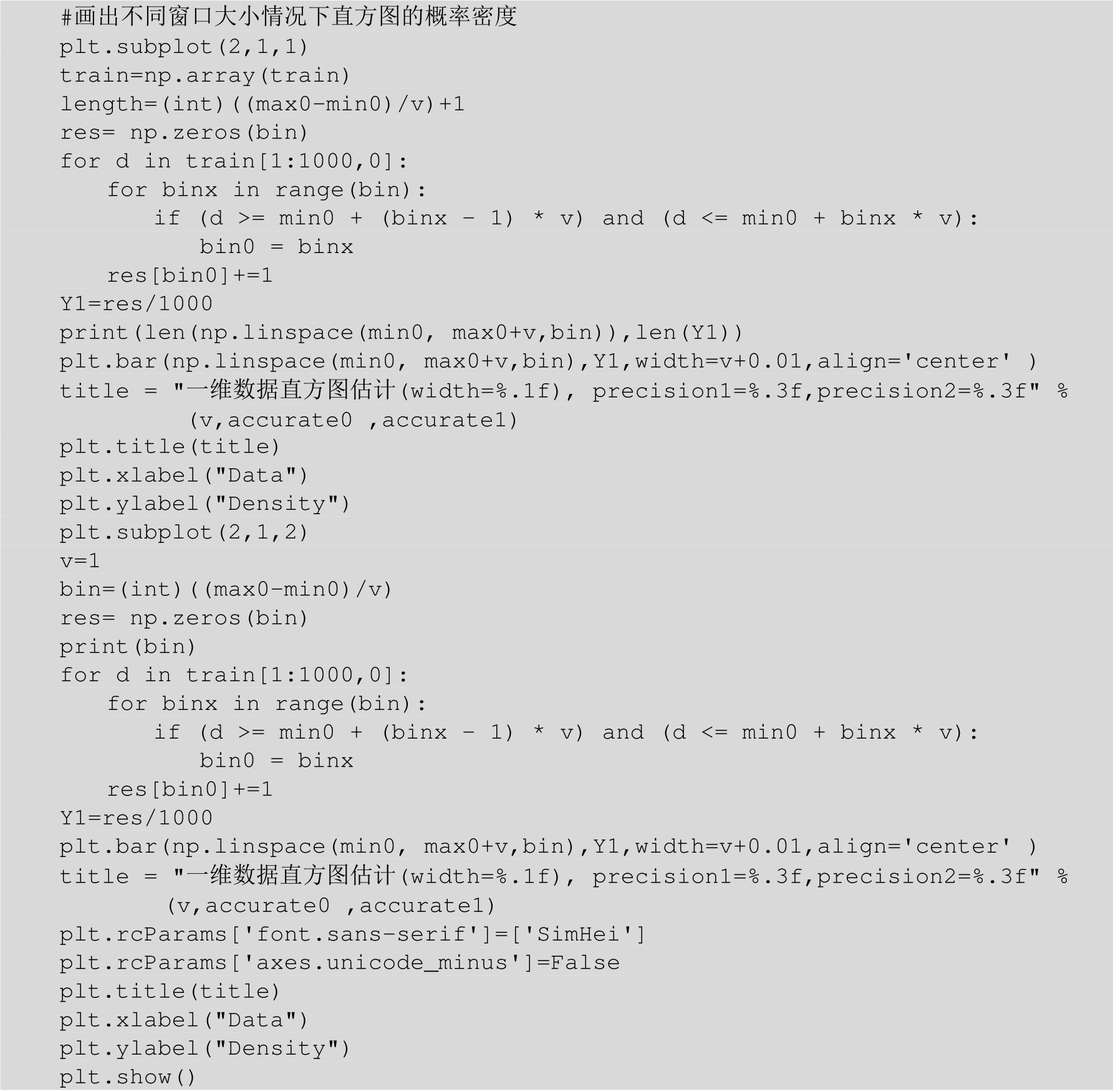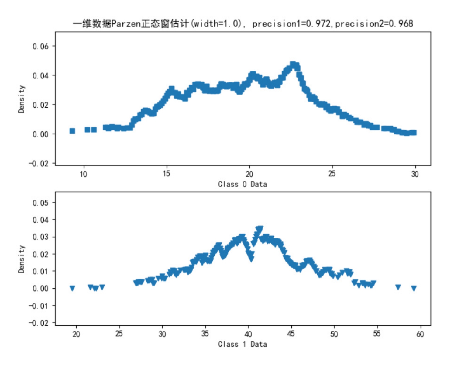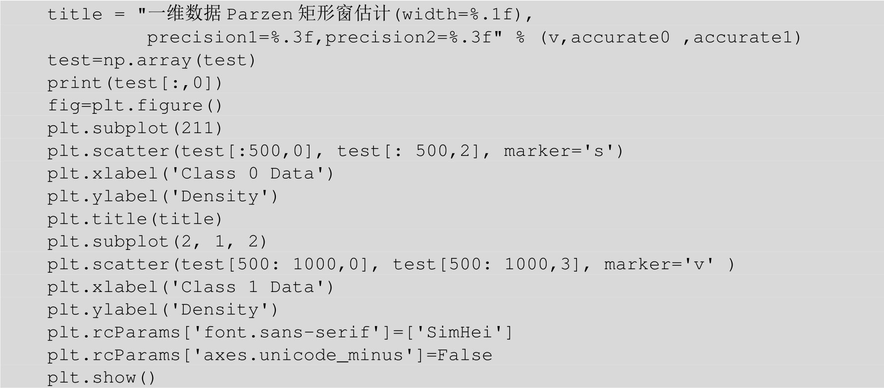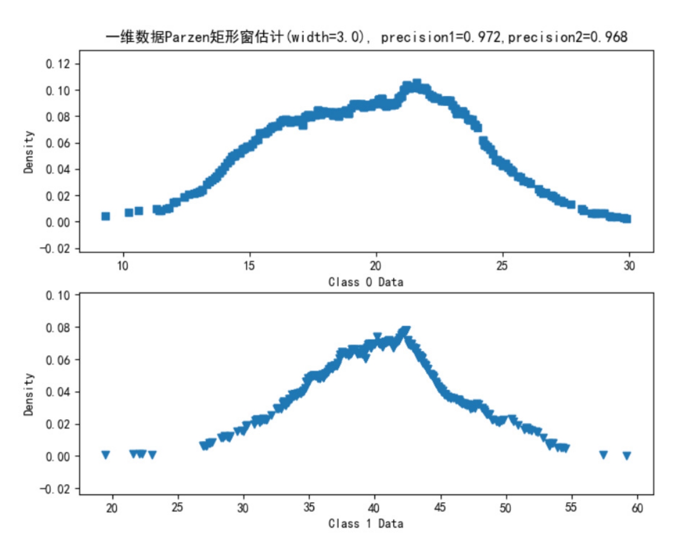 与直方图密度估计类似,利用Parzen矩形窗公式可以实现对概率密度的估计及分类,以下是核心代码: