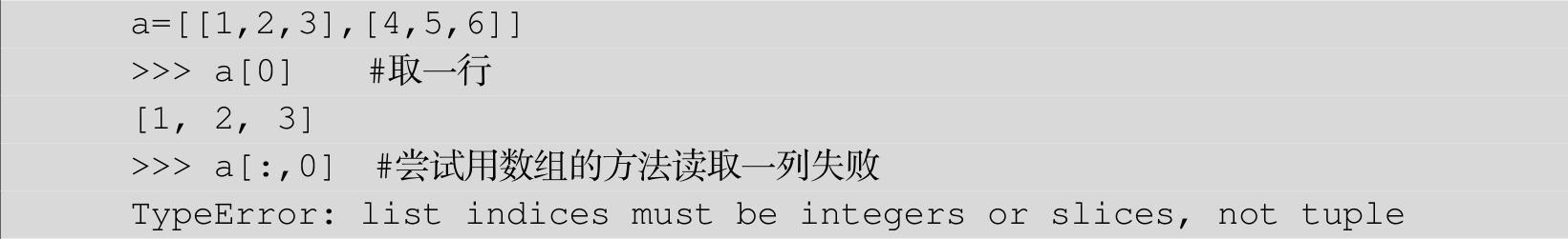 对于嵌套的列表list和数组NumPy,读取一列的方法是不一样的。一个列表中可以存放不同类型的数据,包括int、float和str,甚至布尔型;而一个数组中存放的数据类型必须全部相同,int或float。例如: