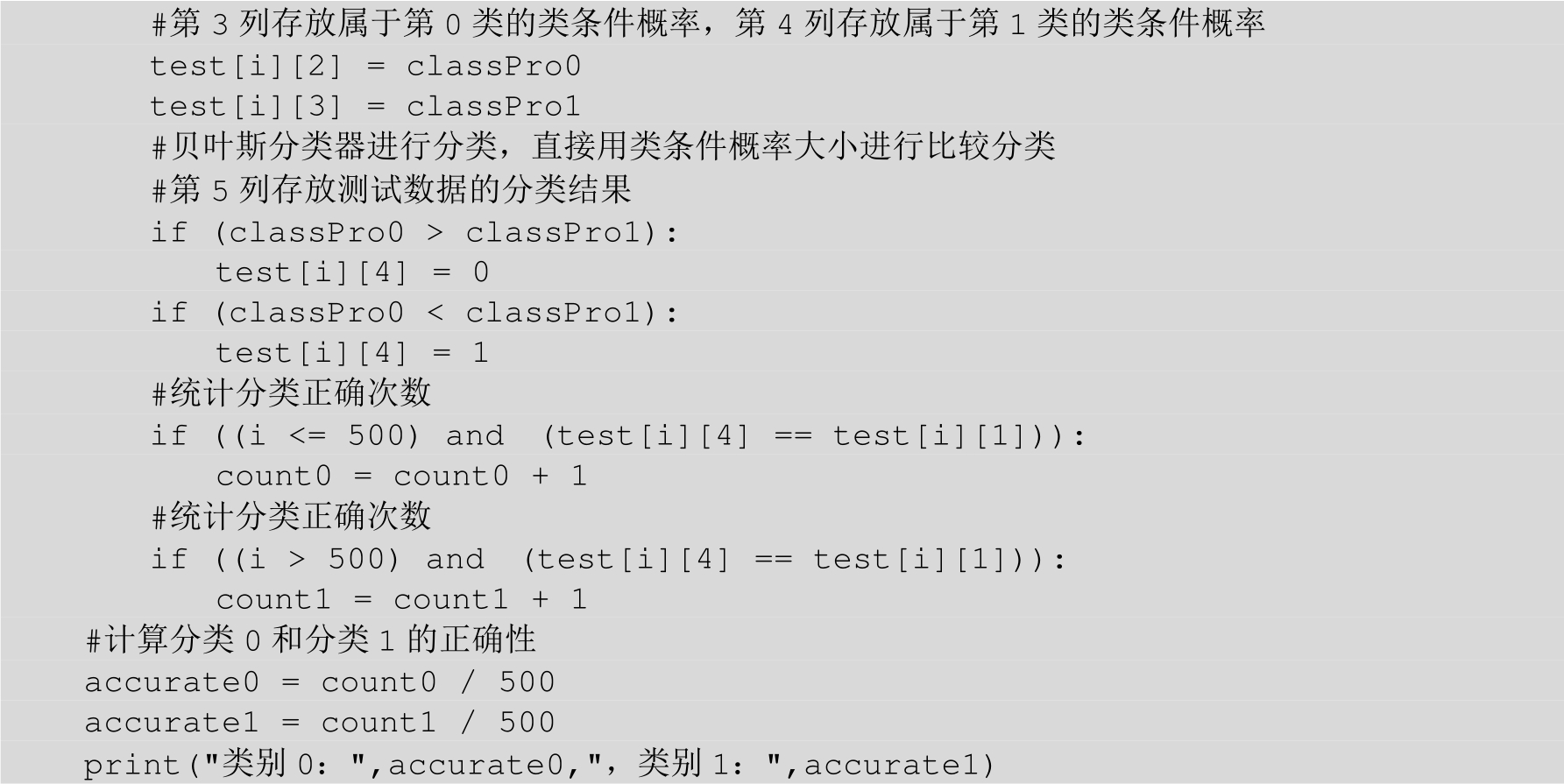 修改2.2.2节代码,可分别得到测试样本属于两类数据的概率,其核心代码如下: