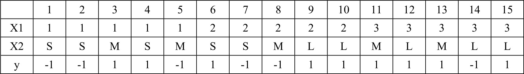 2.对于表3-3中的样本,假设这些样本特征都是相互独立的,请训练一个朴素贝叶斯分类器,并预测样本 x =(2, S ) T 是属于哪一类的?