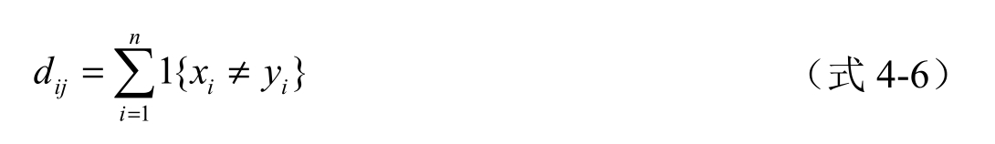 汉明距离(Hamming Distance)需要将处理的样本数据转换为0和1表示的二进制串,样本中各分量的取值只能是0或1,例如字符串“1110”与“1001”之间的汉明距离为3。对于任意样本特征 x 和 y ,有 x,y ∈{0,1},其汉明距离为: