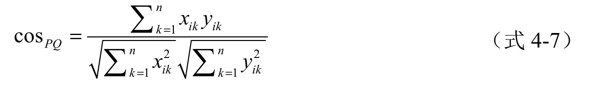 夹角余弦(Cosine)度量将样本看成是高维空间中的向量进行度量,度量方法就是计算两个向量的余弦夹角。对于任意两个n维样本 P =( x i 1 , x i 2 ,..., x in )和 Q =( y i 1 , y i 2 ,..., y in ),其夹角余弦为: