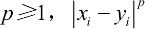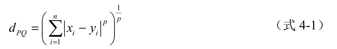 闵可夫斯基距离(Minkowski Distance)将样本看作高维空间中的点进行距离度量。对于n维空间中任意两个样本点 P =( x 1 , x 2 ,..., x n ) T 和 Q =( y 1 , y 2 ,..., y n ) T , P 和 Q 的闵可夫斯基距离定义为: