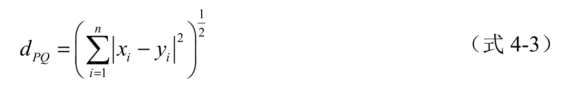 此时, d PQ 就表示二维空间中两个点 P 和 Q 之间的直线距离,称为欧几里得距离或欧氏距离(Euclidean Distance)。