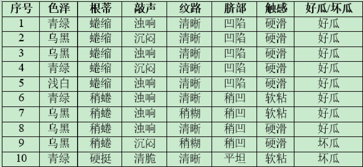 接下来,我们分别统计好瓜中色泽为“青绿”“乌黑”“浅白”所占的比例,根蒂为“蜷缩”“稍蜷”“硬挺”所占的比例,敲声为“浊响”“沉闷”“清脆”所占的比例,等等,然后依据这些统计数据建立一个数学模型,可以理解为是一个数学函数,根据这个数学模型去判断具有这些特征的瓜是好瓜还是坏瓜。根据这些特征建立模型的过程就是机器学习的过程,根据模型去识别好瓜和坏瓜的过程就是机器学习中的分类问题。