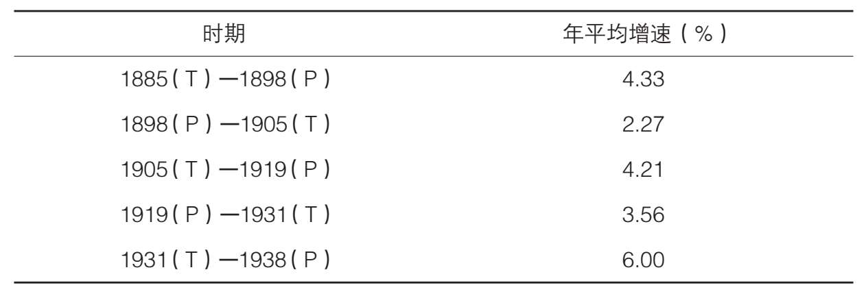 大川和罗索夫斯基(Ohkawa and Rosovsky,1973)将日本现代经济增长的开始时间确定为19世纪80年代中期,此时经济增长速度突然加快。1879年至1885年的年均经济增速为1.2%,1885年至1898年的年均增速为4.3%。